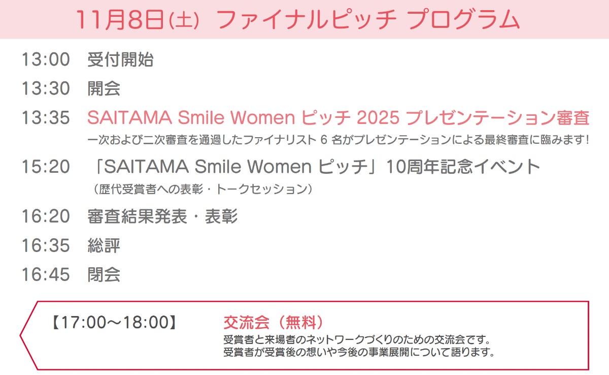 SAITAMA Smile Women ピッチは、埼玉県が主催する女性のためのビジネスプランコンテストです。